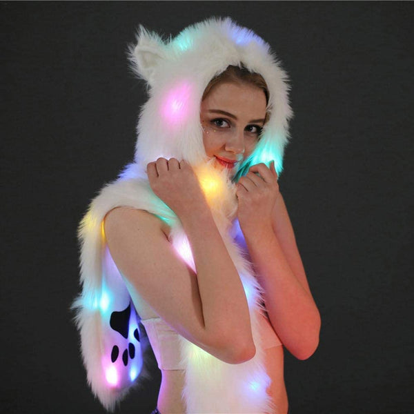 Con sus pelos largos y luces LED, este gorro de piel promete un estilo moderno y colorido. Tanto suave como comodo, tambien añadira ambiente a tus fiestas y espectaculos.