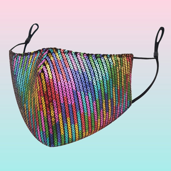 Esta tapabocas de lentejuelas cosidas traerá alegría y color. Diseñado con un sistema ajustable para la comodidad de todos. Lavable a mano.
